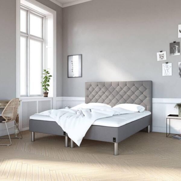 Sætter består af 2 stk boxmadrasser 90 x 200 cm polstret med lys grå møbelbetræk.