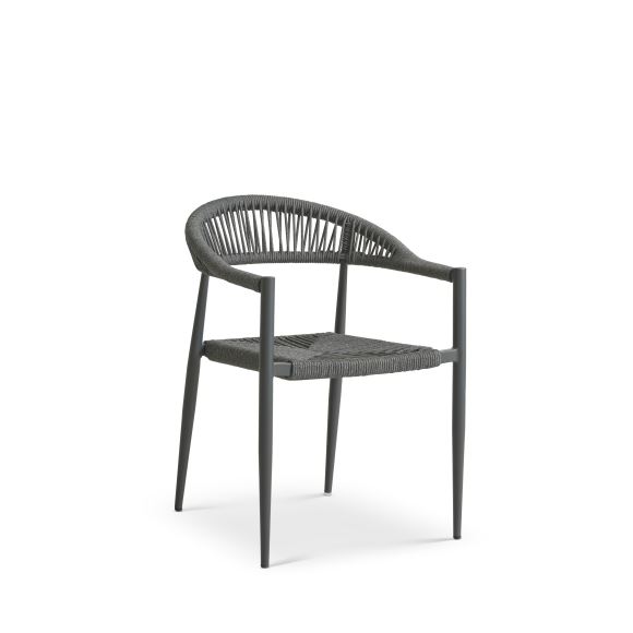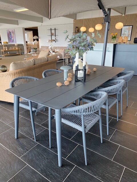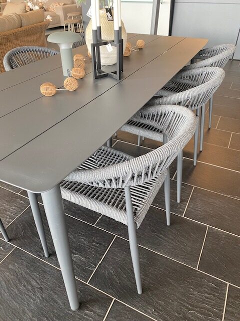 Bordet er fremstillet i antracitfarvet aluminium, som giver et stilrent og moderne udtryk samtidig med, at det er robust og vejrbestandigt. Stolene er designet med fokus på komfort og er udført med elegant reb i antracit, som giver et eksklusivt og let look.